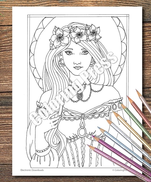 Lady With Flowers and Jewels Coloring Page - Electronic Download