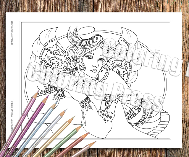 Steampunk Lady Coloring Page - Electronic Download
