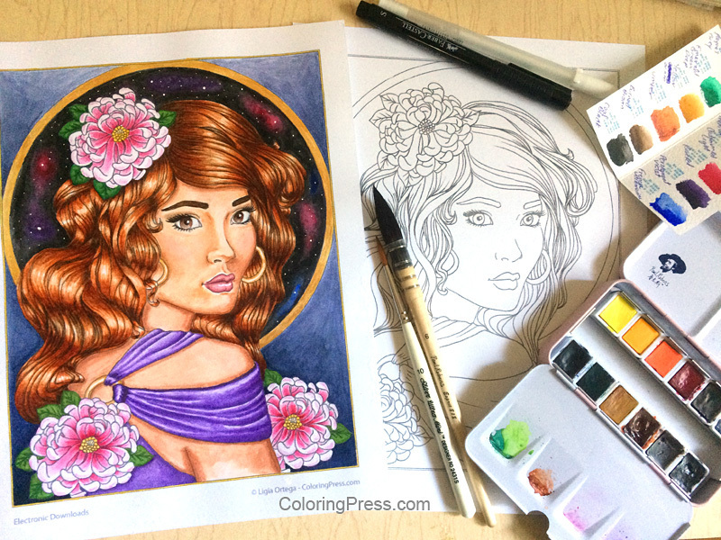 A beautiful lady with flowing hair and Chrysanthemums, this is the fourth page from one of the books I am currently working on. She is ready to be printed out on your favorite paper to be colored. This particular download includes a lighter version for anyone who wants less prominent lines, and a bonus grayscale page. You will receive a high quality electronic file in PDF format.